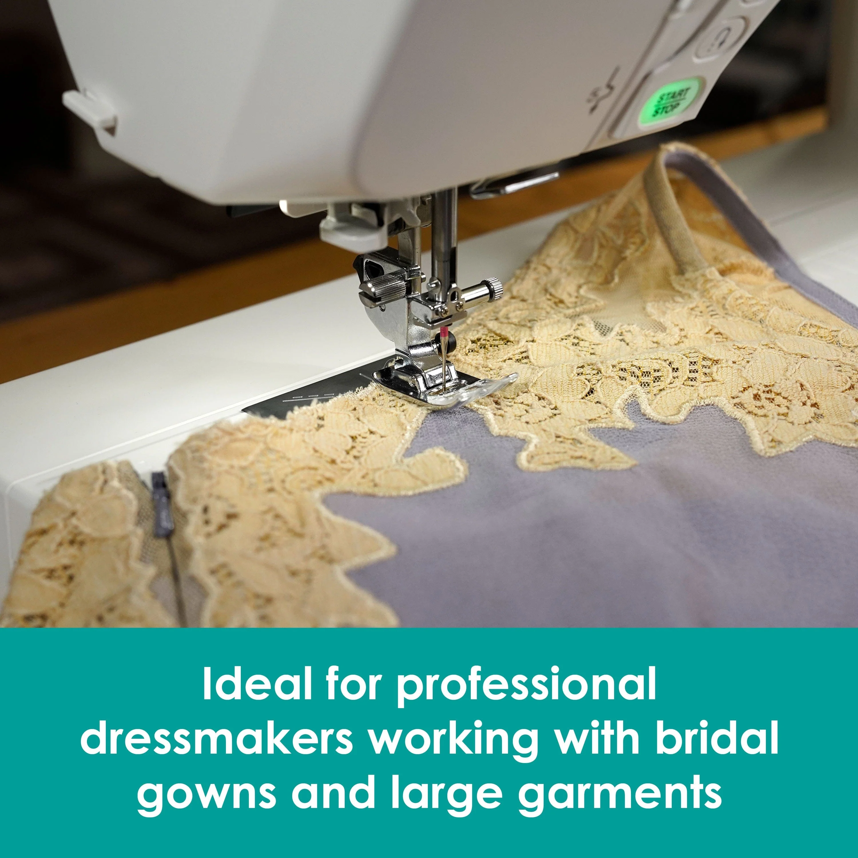 The 7 piece feed dog teeth and square feed drive system make for great fabric control. The teeth can be lowered for free hand/ free motion work. The presser foot has adjustable pressure and extra high lift for thicker/bulky projects. A convenient adjustable knee lift is included, it can be adjusted to suit you for a comfortable experience.